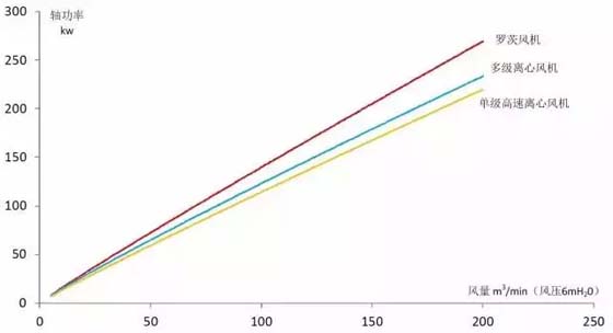 綜合考慮,在小流量范圍內(nèi)羅茨風機具有價格優(yōu)勢,在中流量范圍內(nèi),多級離心風機性價比較好,高流量時,單級高速離心風機綜合成本最低。在實際選型中還要考慮流量調(diào)節(jié)的需求、安裝條件以及運行維護方便性等因素。